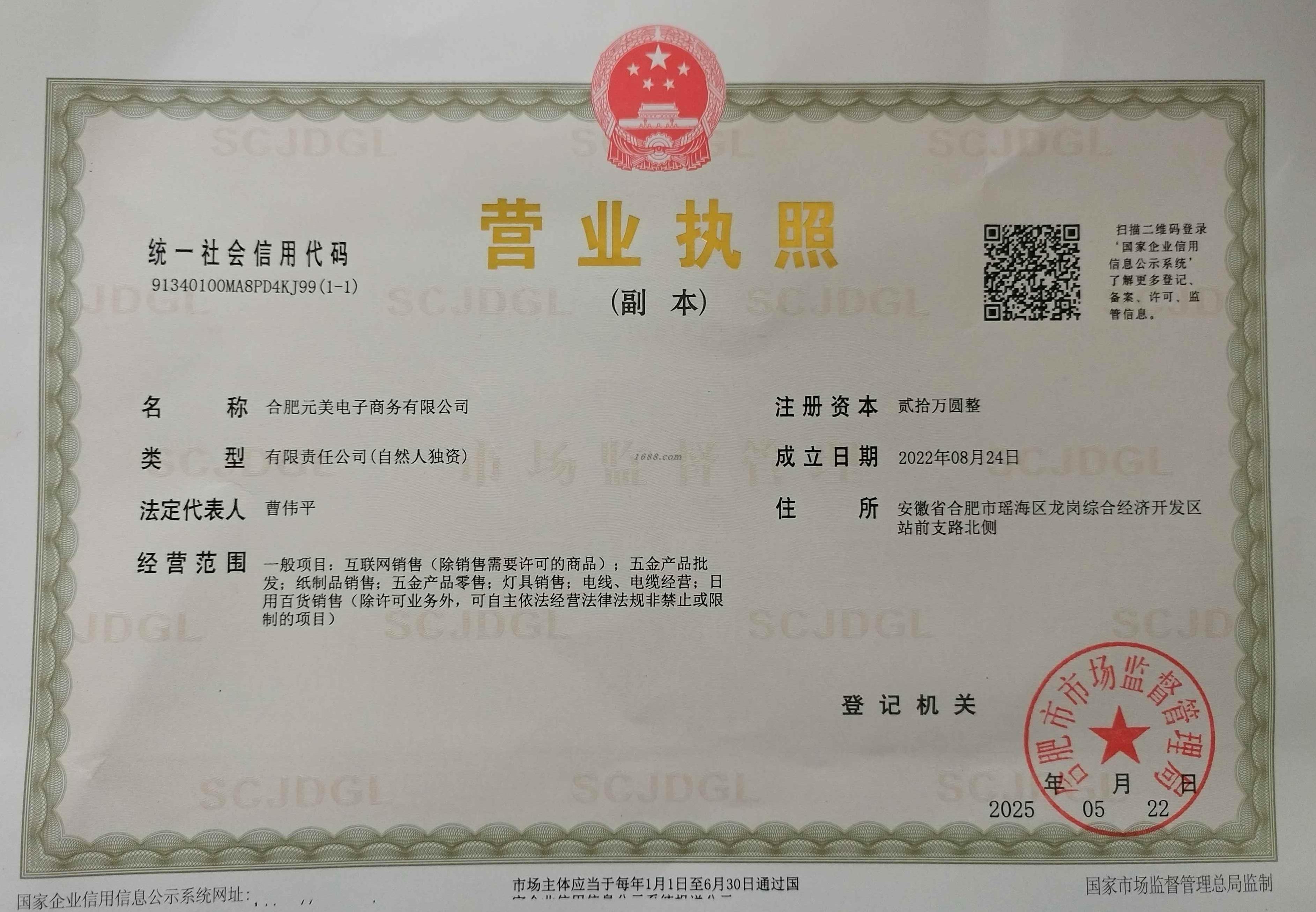 一般项目:互联网销售(除销售需要许可的商品);五金产品批发;纸制品销售;五金产品零售;灯具销售;电线、电缆经营;日用百货销售(除许可业务外,可自主依法经营法律法规非禁止或限制的项目)