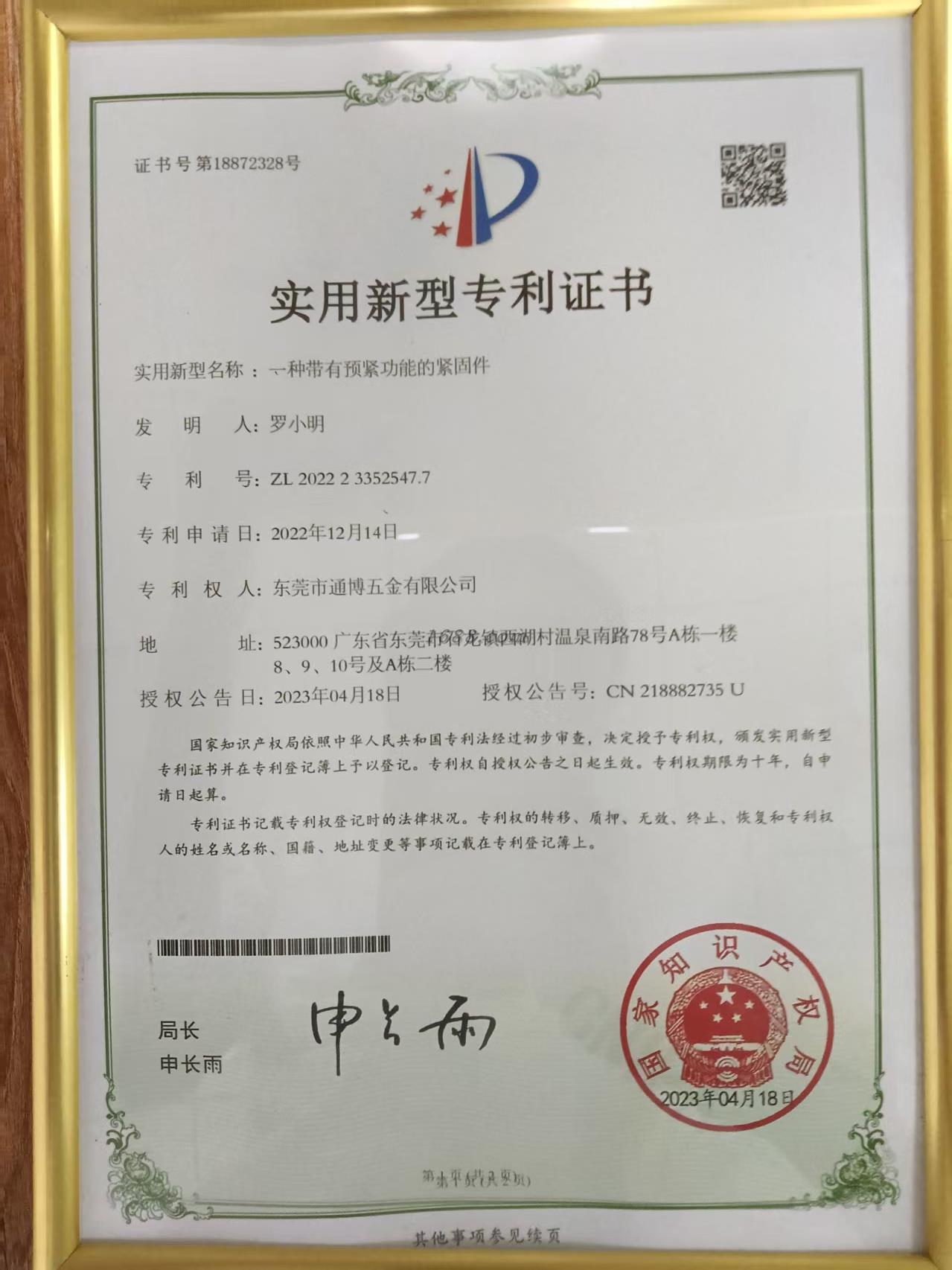一种带有预紧功能的紧固件 (专利号: ZL 2022 2 3352547.7)